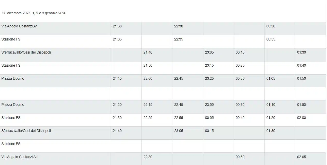 Dal 30 dicembre 2025 al 3 gennaio 2025 sarà attivo un servizio speciale Navetta gratuito con i seguenti orari